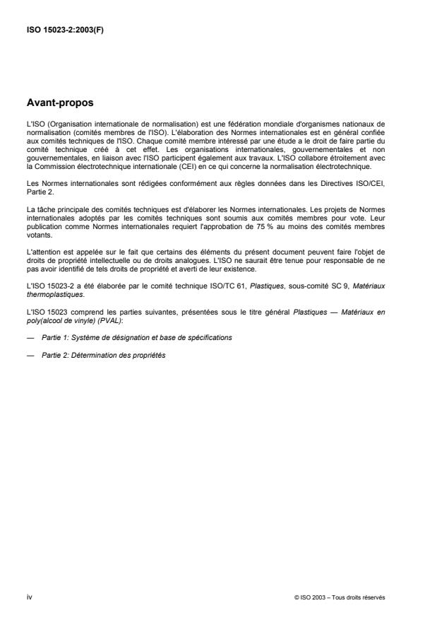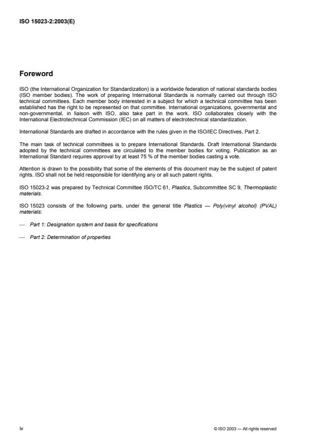 ISO 15023 consists of the following parts, under the general title Plastics — Poly(vinyl alcohol) (PVAL)