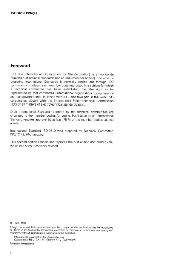 ISO 3619:1994 is a standard published by the International Organization for Standardization (ISO). Its full title is "Photography - Processing chemicals - Specifications for ammonium thiosulfate solution". This standard covers: Cancels and replaces the first edition (1976). Establishes criteria for the purity of photographic-grade ammonium thiosulfate solution and specifies the tests to be used to determine the purity.