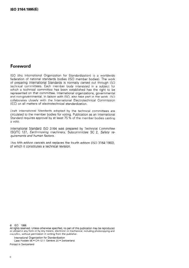 ISO 3164:1995 is a standard published by the International Organization for Standardization (ISO). Its full title is "Earth-moving machinery - Laboratory evaluations of protective structures - Specifications for deflection-limiting volume". This standard covers: Specifies the deflection-limiting volume (DLV) to be used when performing laboratory evaluations of protective structures which provide protection to operators of earth-moving machinery.