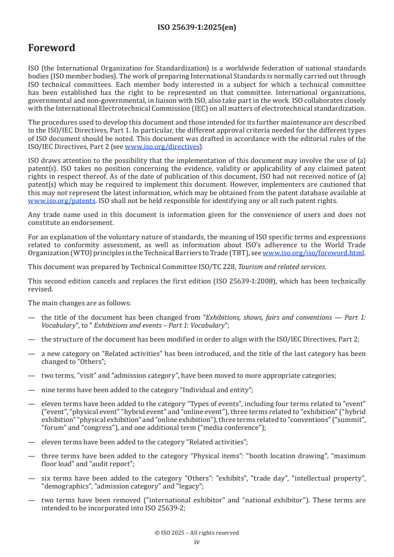 ISO 25639-1:2025 - Exhibitions and events, Part 1: Vocabulary is an international standard that defines common terms and classifications used across the exhibition and event industry. This second edition updates and expands the 2008 version to reflect digital transformation, hybrid event formats and post‑pandemic industry practice. The document groups definitions into five practical categories to ensure consistent interpretation of industry terminology worldwide.
