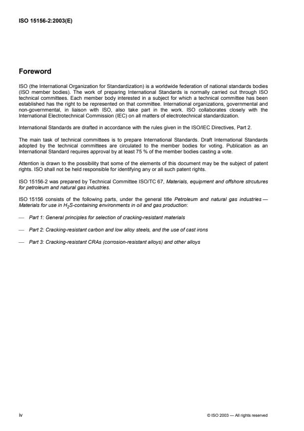 ISO 15156-2:2003 is a standard published by the International Organization for Standardization (ISO). Its full title is "Petroleum and natural gas industries — Materials for use in H2S-containing environments in oil and gas production — Part 2: Cracking-resistant carbon and low alloy steels, and the use of cast irons". This standard covers: ISO 15156-2:2003 gives requirements and recommendations for the selection and qualification of carbon and low alloy steels for service in equipment, used in oil and natural gas production and natural gas treatment plants in H2S-containing environments, whose failure could pose a risk to the health and safety of the public and personnel or to the environment. It can be applied to help to avoid costly corrosion damage to the equipment itself. It supplements, but does not replace, the materials' requirements of the appropriate design codes, standards or regulations. ISO 15156-2:2003 addresses the resistance of these steels to damage that may be caused by sulfide stress-cracking (SSC) and the related phenomena of stress-oriented hydrogen-induced cracking (SOHIC) and soft-zone cracking (SZC). ISO 15156-2:2003 also addresses the resistance of these steels to hydrogen-induced cracking (HIC) and its possible development into stepwise cracking (SWC). ISO 15156-2:2003 is only concerned with cracking. Loss of material by general (weight loss) or localized corrosion is not addressed. Table 1 provides a non-exhaustive list of equipment to which this part of ISO 15156 is applicable, including permitted exclusions. ISO 15156-2:2003 applies to the qualification and selection of materials for equipment designed and constructed using conventional elastic design criteria. For designs utilizing plastic criteria (e.g. strain-based and limit-state designs), see ISO 15156-1:2001, Clause 5. Annex A lists SSC-resistant carbon and low alloy steels, and A.2.4 includes requirements for the use of cast irons. ISO 15156-2:2003 is not necessarily suitable for application to equipment used in refining or downstream processes and equipment.