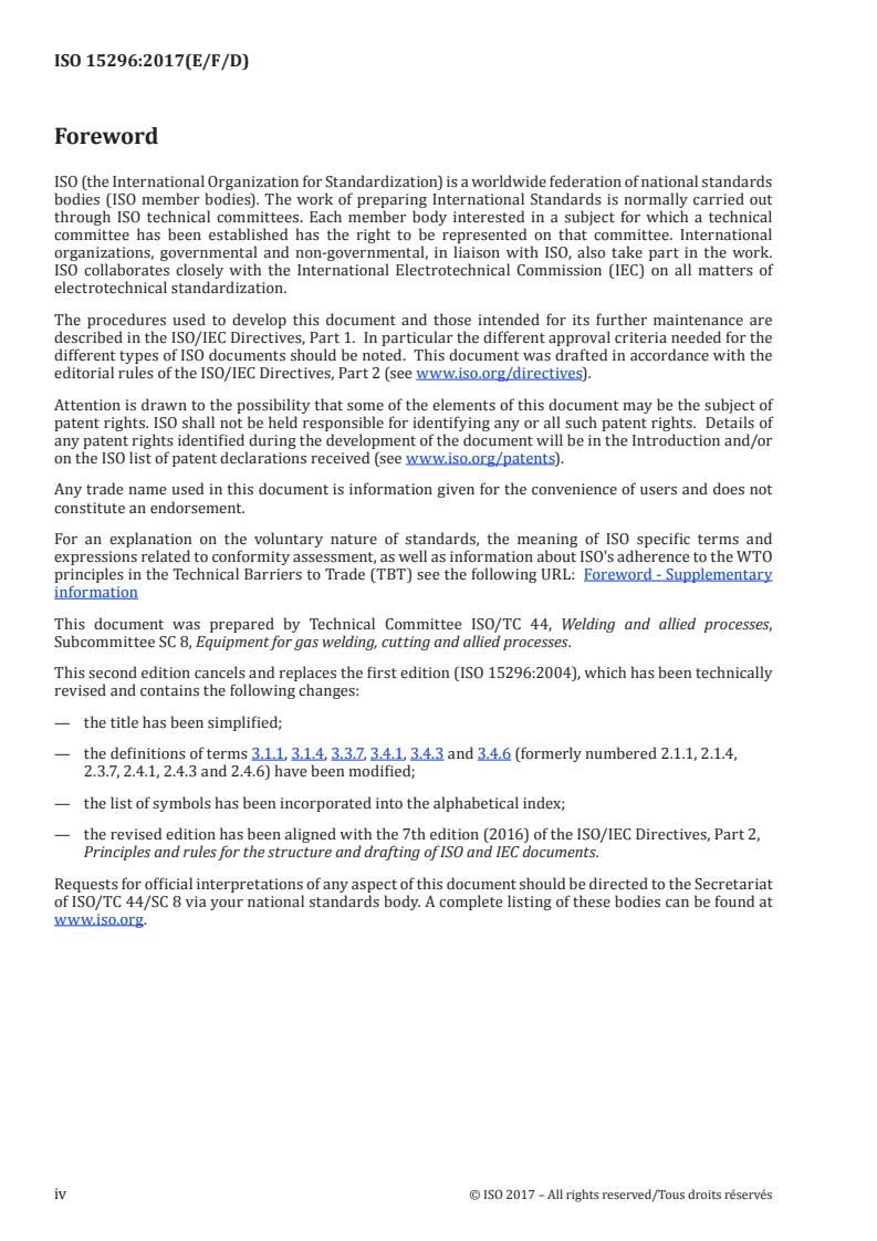 ISO 15296:2017 supports and complements other ISO standards on welding and allied processes by providing consistent terminology. It was prepared by ISO/TC 44 (Welding and allied processes) and aligned with the ISO/IEC Directives for drafting ISO documents.