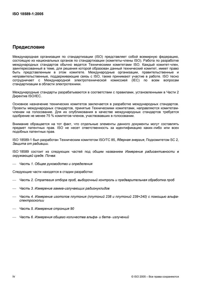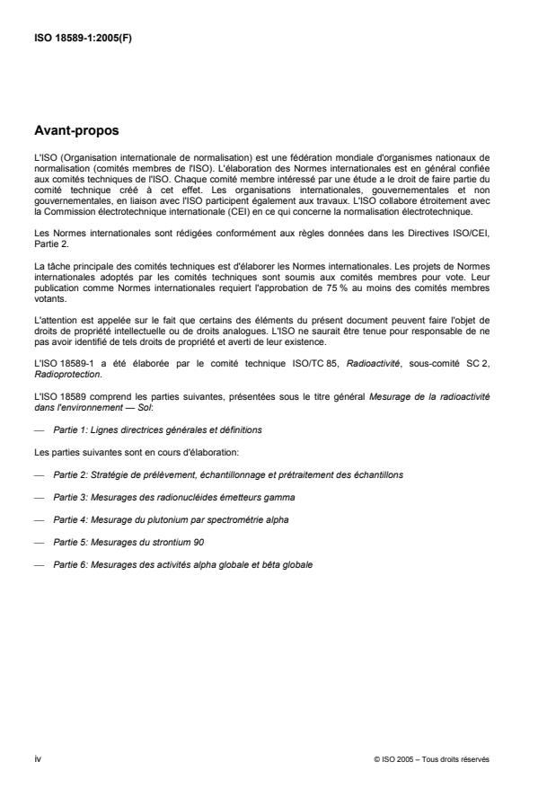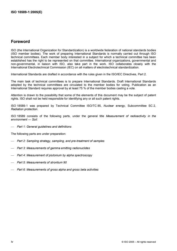 ISO 18589-1:2005 is a standard published by the International Organization for Standardization (ISO). Its full title is "Measurement of radioactivity in the environment — Soil — Part 1: General guidelines and definitions". This standard covers: ISO 18589-1:2005 specifies the general requirements to carry out radionuclides tests on soil sample, including sampling. ISO 18589-1:2005 is addressed to people responsible for determining the radioactivity present in soils for the purpose of radiation protection. This may concern soils from gardens and farmland, urban or industrial sites, as well as soil not affected by human activities. ISO 18589-1:2005 is applicable to all laboratories regardless of the number of personnel or the extent of the scope of testing activities. When a laboratory does not undertake one or more of the activities covered by this part of ISO 18589, such as planning, sampling or testing, the requirements of those clauses do not apply. ISO 18589-1:2005 is to be used in conjunction with other parts of ISO 18589 that outline the setting up of programmes and sampling techniques, methods of general processing of samples in the laboratory and also methods for measuring the radioactivity in soil. ISO 18589-1:2005 is applicable if radionuclide measurements for the purpose of radiation protection are to be made in following cases: initial characterization of radioactivity in the environment; routine surveillance of the impact of nuclear installations or of the evolution of the general territory; investigations of accident and incident situations; planning and surveillance of remedial action; decommissioning of installations or clearance of materials.