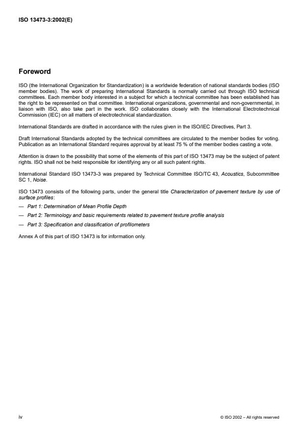 ISO 13473-3:2002 is a standard published by the International Organization for Standardization (ISO). Its full title is "Characterization of pavement texture by use of surface profiles — Part 3: Specification and classification of profilometers". This standard covers: ISO 13473-3:2002 specifies requirements for profilometers used in pavement engineering in order to give meaningful and accurate measurement of micro-, macro- and megatexture characteristics of paved road and airfield surfaces. It also includes schemes for the classification of such profilometers with respect to their use and overall accuracy. The profilometers may be of any operational type. The scope of ISO 13473-3:2002 does not include profile analysis of machined surfaces. Also excluded from the scope is the profile analysis of road unevenness.
