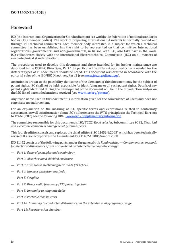 ISO 11452-1:2015 is a standard published by the International Organization for Standardization (ISO). Its full title is "Road vehicles - Component test methods for electrical disturbances from narrowband radiated electromagnetic energy - Part 1: General principles and terminology". This standard covers: ISO 11452-1:2015 specifies general conditions, defines terms, gives practical guidelines, and establishes the basic principles of the component tests used in the other parts of ISO 11452 for determining the immunity of electronic components of passenger cars and commercial vehicles to electrical disturbances from narrowband radiated electromagnetic energy, regardless of the vehicle propulsion system (e.g. spark-ignition engine, diesel engine, electric motor). The electromagnetic disturbances considered are limited to continuous narrowband electromagnetic fields. A wide frequency range (d.c. and 15 Hz to 18 GHz) is allowed for the immunity testing of the components in this and in the other parts of ISO 11452.