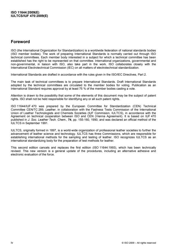 ISO 11644:2009 is a standard published by the International Organization for Standardization (ISO). Its full title is "Leather — Test for adhesion of finish". This standard covers: ISO 11644:2009 specifies a method for measuring the adhesion of the finish to leather or the adhesion between two adjacent layers of the finish. The method is valid for all finished leathers with a smooth surface that can be bonded to an adherent-plate without the adhesive penetrating into the finish. Preliminary experiments might be necessary to determine whether these conditions are met. This test method is valid for finished leathers with a finish-coat thickness of at least 15 µm.