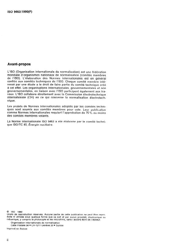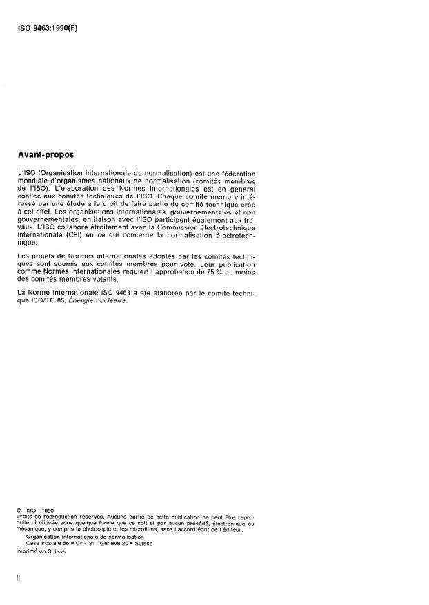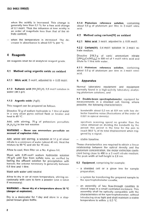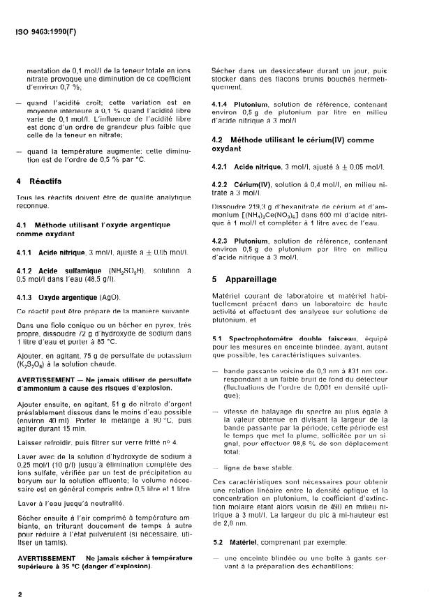 ISO 9463:1990 is a standard published by the International Organization for Standardization (ISO). Its full title is "Nitric acid feed solutions from reprocessing plants — Spectrophotometric determination of plutonium after oxidation to plutonium(VI)". This standard covers: The method is applicable, without interference, in the presence of numerous cations, it is applicable to test portions containing between 0,5 mg and 2,5 mg of plutonium. Specifies principle, chemical conditions, reagents, apparatus, operating procedure, expression of results and interferences.