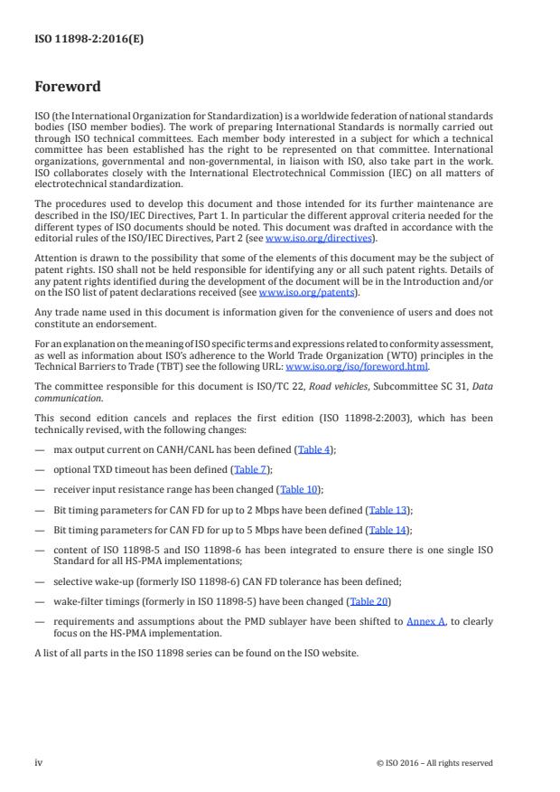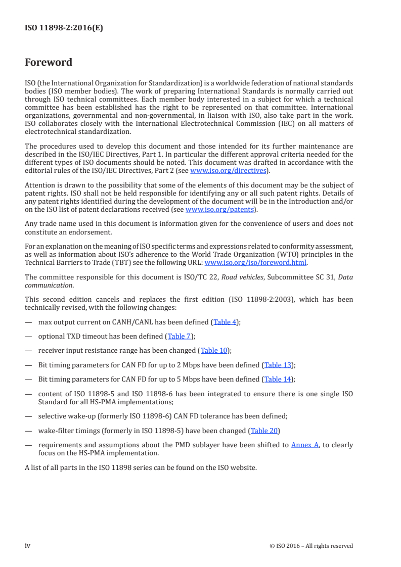 ISO 11898-2:2016 specifies the high-speed physical media attachment (HS-PMA) of the controller area network (CAN), a serial communication protocol that supports distributed real-time control and multiplexing for use within road vehicles. This includes HS-PMAs without and with low-power mode capability as well as with selective wake-up functionality. The physical media dependant sublayer is not in the scope of this document.