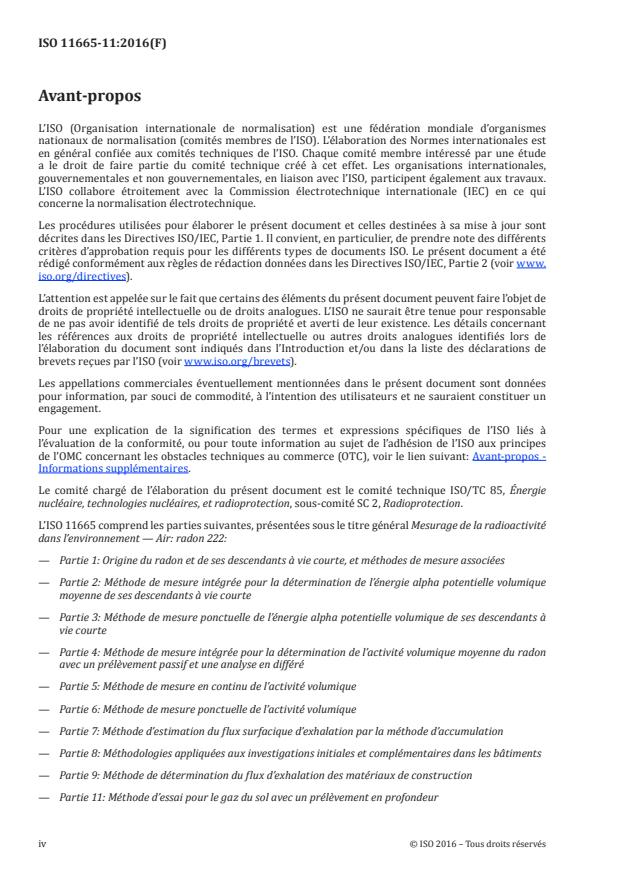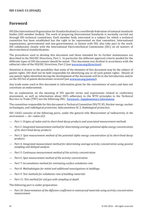 ISO 11665-11:2016 is a standard published by the International Organization for Standardization (ISO). Its full title is "Measurement of radioactivity in the environment — Air: radon-222 — Part 11: Test method for soil gas with sampling at depth". This standard covers: ISO 11665-11:2016 describes radon-222 test methods for soil gas using passive and active in-situ sampling at depth comprised between surface and 2 m. ISO 11665-11:2016 gives general requirements for the sampling techniques, either passive or active and grab or continuous, for in-situ radon-222 activity concentrations measurement in soil gas. The radon-222 activity concentration in the soil can be measured by spot or continuous measurement methods (see ISO 11665‑1). In case of spot measurement methods (ISO 11665‑6), the soil gas sampling is active only. On the other hand, the continuous methods (ISO 11665‑5) are typically associated with passive soil gas sampling. The measurement methods are applicable to all types of soil and are determined according to the end use of the measurement results (phenomenological observation, definition or verification of mitigation techniques, etc.) taking into account the expected level of the radon-222 activity concentration. These measurement methods are applicable to soil gas samples with radon activity concentrations greater than 100 Bq/m3. NOTE This part of ISO 11665 is complementary with ISO 11665‑7 for characterization of the radon soil potential.