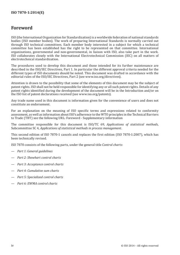 ISO 7870-1:2014 presents key elements and philosophy of the control chart approach, and identifies a wide variety of control charts (including those related to the Shewhart control chart, those stressing process acceptance or online process adjustment, and specialized control charts). It presents an overview of the basic principles and concepts and illustrates the relationship among various control chart approaches to aid in the selection of the most appropriate standard for given circumstances. It does not specify statistical control methods using control charts. These methods will be specified in future parts of ISO 7870.