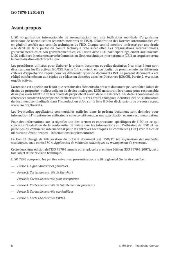 L'ISO 7870-1:2014 présente les principaux éléments et démarches de la carte de contrôle; elle identifie également une large gamme de cartes de contrôle (y compris celles liées à la carte de contrôle de Shewhart, celles qui mettent l'accent sur l'acceptation du processus ou les approches prédictives continues, et les cartes de contrôle particulières). Elle donne une présentation générale des principes et concepts fondamentaux et illustre les rapports entre les diverses approches de cartes de contrôle pour aider à choisir celle qui convient le mieux à des circonstances données. Elle ne spécifie pas des méthodes de maîtrise statistique utilisant des cartes de contrôle. Ces méthodes feront l'objet d'autres parties de l'ISO 7870.