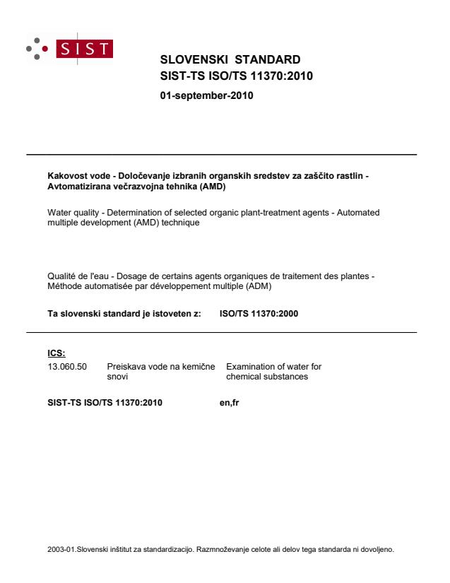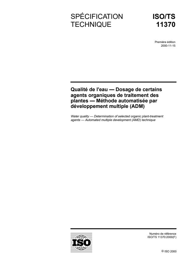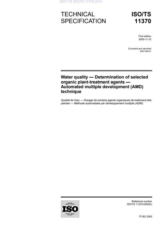 ISO/TS 11370:2000 is a technical specification published by the International Organization for Standardization (ISO). Its full title is "Water quality — Determination of selected organic plant-treatment agents — Automated multiple development (AMD) technique". This standard covers: The method described in this Technical Specification is applicable to the determination of selected plant-treatment agents and some of their main degradation products (metabolites) in drinking water, with a validated reporting limit of about (see examples in Table 1). The method may be extended to include additional substances and ground water, provided the method is validated for each individual case. The selection of the plant-treatment agents and main degradation products in Table 1 and Table A.2 has been made according to the knowledge at the time of the interlaboratory trial (1992). Data for some other substances are given in annex A.