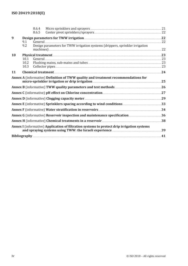 ISO 20419:2018 is a document that provides guidelines for adapting irrigation systems and practices to use treated wastewater for irrigation. It covers adjustments to all components of the irrigation system to ensure compatibility with the quality of treated wastewater in terms of physical, chemical, and biological parameters. The document also includes recommendations for protecting irrigation equipment to maintain high levels of efficiency. It provides guidelines for pumping stations, filtration, water network systems, and various types of irrigation equipment. It also outlines the physical and chemical treatment of irrigation equipment. The document defines the parameters of treated wastewater that should be used at the inlet of the irrigation system after it has gone through a wastewater treatment plant, in order to ensure optimal functioning and uniformity of water discharge from the emitters.