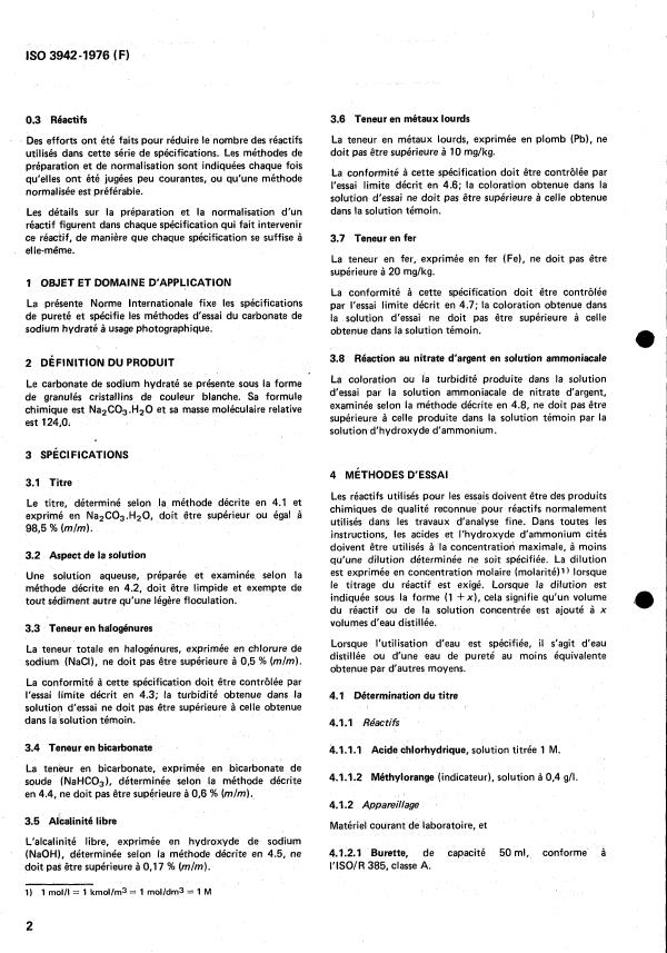 ISO 3942:1976 - Carbonate de sodium hydraté de qualité photographique -- Spécifications