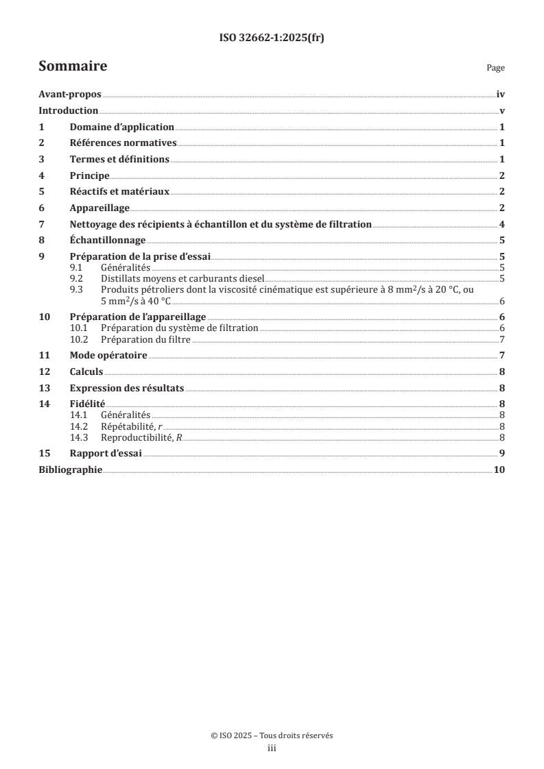 Le présent document spécifie une méthode de détermination de la teneur en substances non dissoutes, référencée comme contamination totale, dans les distillats moyens, dans les gazoles contenant jusqu’à 30 % en fraction volumique d’esters méthyliques d’acides gras (EMAG). Le domaine d’application s’étend sur un intervalle de teneurs en contaminants allant de 12 mg/kg à 26 mg/kg; celui-ci a été établi au moyen d’une étude interlaboratoires conformément à l’ISO 4259-1[ REF Reference_ref_7 \r \h 4]. D’une manière générale, le présent document est applicable aux produits dont la viscosité cinématique ne dépasse pas 8 mm2/s à 20 °C, ou 5 mm2/s à 40 °C. Cette méthode d’essai peut être utilisée sur des gazoles paraffiniques tels que spécifiés dans l’EN 15940, sur des carburants diesel contenant une fraction volumique d’EMAG de plus de 30 % et sur des produits pétroliers dont la viscosité cinématique est supérieure à 8 mm2/s à 20 °C, ou 5 mm2/s à 40 °C, cependant, dans de tels cas, les valeurs de fidélité concernant cette méthode n’ont pas été déterminées. AVERTISSEMENT — L'utilisation du présent document peut impliquer l'intervention de produits, d'opérations et d'équipements à caractère dangereux. Ce document n'est pas censé aborder tous les problèmes de sécurité concernés par sa mise en œuvre. Il est de la responsabilité de l'utilisateur de consulter et d'établir des règles de sécurité et d'hygiène appropriées et de déterminer l'applicabilité des restrictions réglementaires avant utilisation.