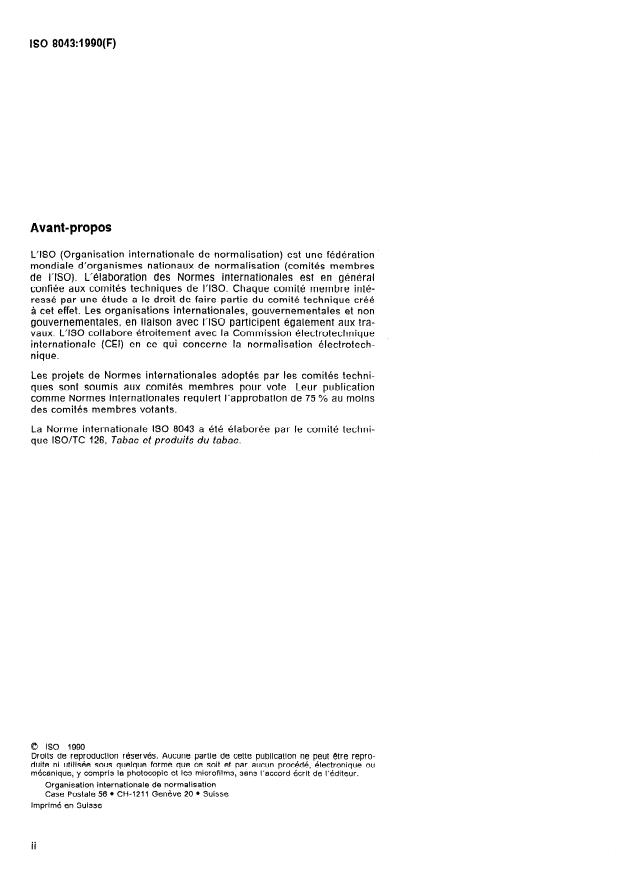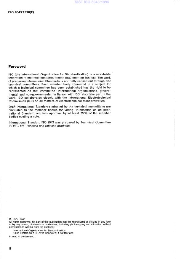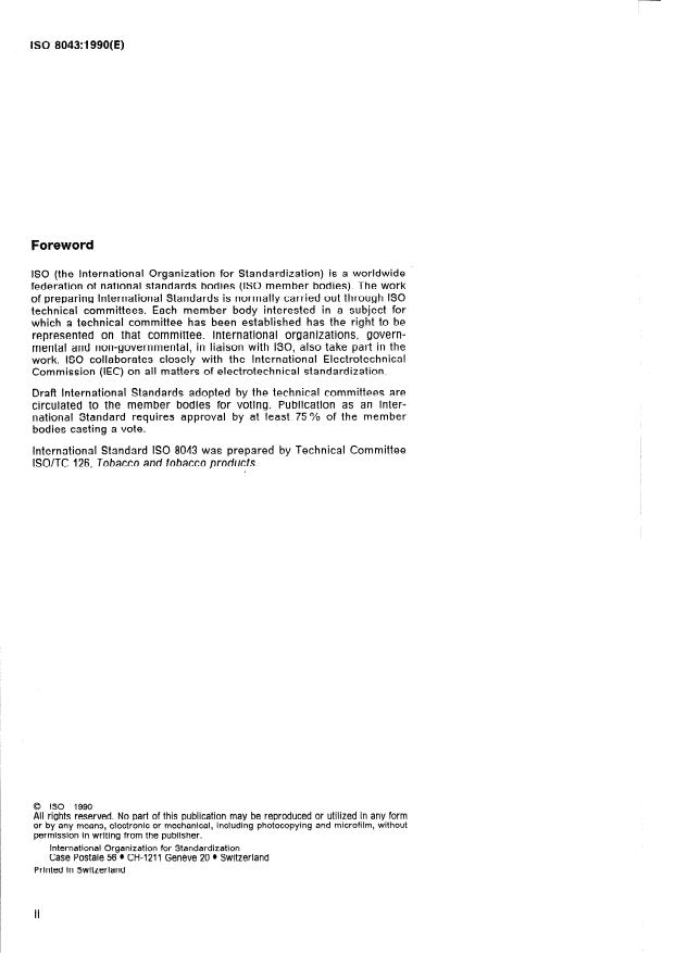 ISO 8043:1990 is a standard published by the International Organization for Standardization (ISO). Its full title is "Oriental leaf tobacco — Determination of form and size characteristics". This standard covers: Specifies a method for determination of form and size characteristics of oriental leaf tobacco from transplanting until used as raw material for cigarette manufacture. Applies to all oriental varieties.