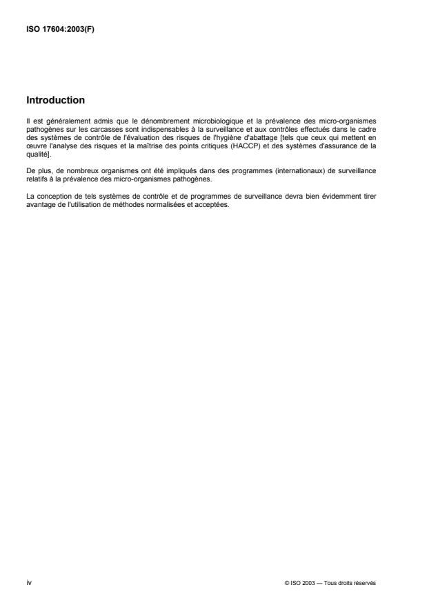 L'ISO 17604:2003 spécifie des méthodes de prélèvement en vue de la recherche et du dénombrement des micro-organismes à la surface de carcasses d'animaux de boucherie venant d'être abattus. L'échantillonnage microbiologique peut être effectué dans le cadre du contrôle des processus de fabrication (et pour en vérifier la maîtrise) dans les abattoirs de bétail, chevaux, porcs, moutons, chèvres et gibier élevé en captivité, du système de contrôle de l'évaluation des risques appliqué à la sécurité des produits, et des programmes de surveillance pour la prévalence des micro-organismes pathogènes. L'ISO 17604:2003 comporte l'emploi de techniques destructives et non destructives, en fonction de l'objectif du prélèvement d'échantillons. L'ISO 17604:2003 ne traite pas de l'utilisation de plans d'échantillonnage.
