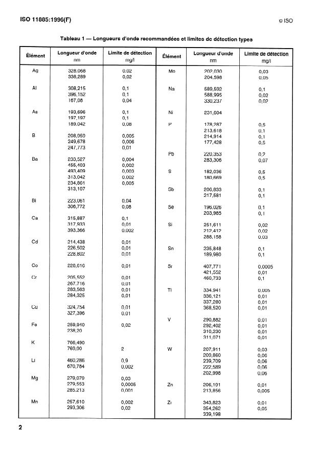 La présente Norme internationale prescrit une méthode pour le dosage d'éléments totaux, dissous ou particulaires dans les eaux brutes, potables ou résiduaires. Les éléments concernés sont les suivants: aluminium, antimoine, arsenic, baryum, béryllium, bismuth, bore, cadmium, calcium, chrome, cobalt, cuivre, fer, plomb, lithium, magnésium, manganèse, molybdène, nickel, phospore, potassium, sélénium, silicium, argent, sodium, strontium, soufre, étain, titane, tungstène, vanadium, zinc, zirconium. Le tableau 1 énumère ces éléments ainsi que les longueurs d'ondes recommandées et les limites de détection instrumentale typiques estimées lorsqu'on utilise une technique de nébulisation pneumatique conventionnelle. Les limites de détection réelles de travail dépendent de l'échantillon et étant donné que la matrice de l'échantillon varie, les concentrations peuvent également varier. En raison des différences existant entre les différents modèles et marques d'instruments satisfaisants, aucune instruction détaillée concernant leur fonctionnement ne peut être fournie. L'opérateur devra donc se référer aux instructions fournies par le fabricant de chaque instrument.