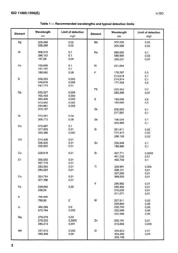 Table 1 lists these elements along with the recommended wavelengths and typical estimated instrumental detection