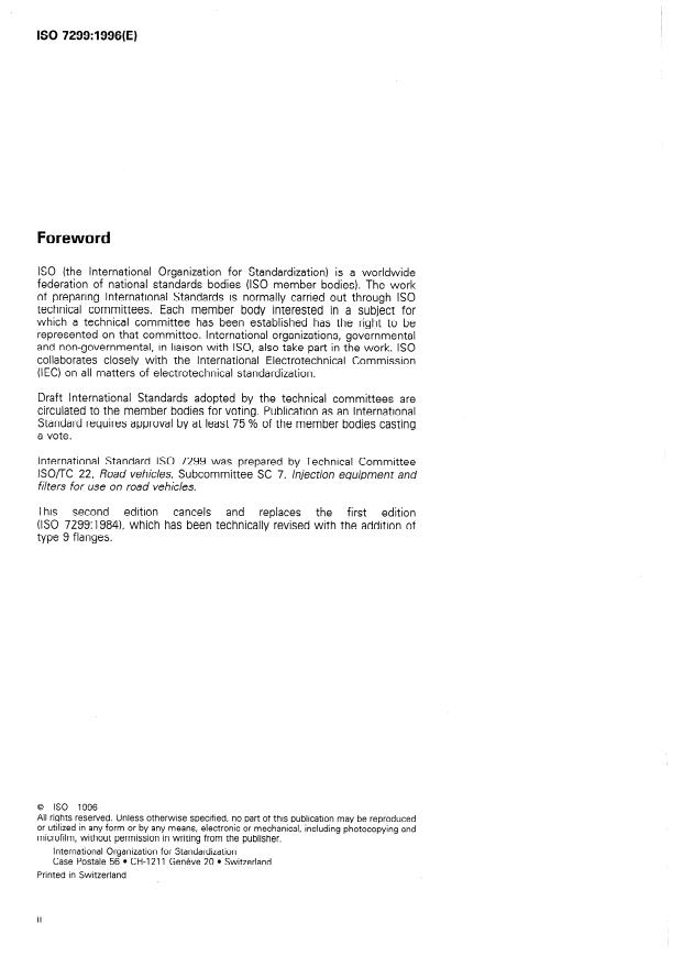 ISO 7299:1996 is a standard published by the International Organization for Standardization (ISO). Its full title is "Diesel engines — End-mounting flanges for fuel injection pumps". This standard covers: Specifies dimensional requirements for four types of end-mounting flange for distributor fuel injection pumps and five types of end mounting flange for in-line fuel injection pumps. Replaces the first edition.