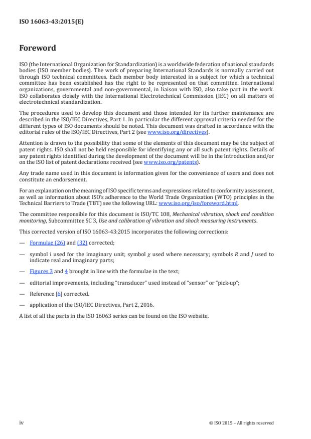 ISO 16063-43:2015 is a standard published by the International Organization for Standardization (ISO). Its full title is "Methods for the calibration of vibration and shock transducers - Part 43: Calibration of accelerometers by model-based parameter identification". This standard covers: ISO 16063-43:2015 prescribes terms and methods on the estimation of parameters used in mathematical models describing the input/output characteristics of vibration transducers, together with the respective parameter uncertainties. The described methods estimate the parameters on the basis of calibration data collected with standard calibration procedures in accordance with ISO 16063‑11, ISO 16063‑13, ISO 16063‑21 and ISO 16063‑22. The specification is provided as an extension of the existing procedures and definitions in those International Standards. The uncertainty estimation described conforms to the methods established by ISO/IEC Guide 98‑3 and ISO/IEC Guide 98‑3:2008/Supplement 1: 2008. The new characterization described in this document is intended to improve the quality of calibrations and measurement applications with broadband/transient input, like shock. It provides the means of a characterization of the vibration transducer's response to a transient input and, therefore, provides a basis for the accurate measurement of transient vibrational signals with the prediction of an input from an acquired output signal. The calibration data for accelerometers used in the aforementioned field of applications should additionally be evaluated and documented in accordance with the methods described below, in order to provide measurement capabilities and uncertainties beyond the limits drawn by the single value characterization given by ISO 16063‑13 and ISO 16063‑22.