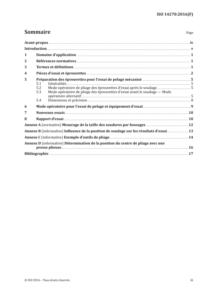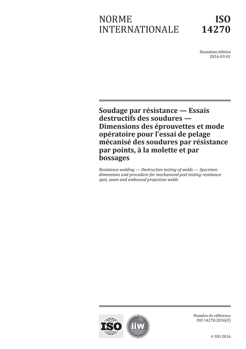 ISO 14270:2016 - Soudage par résistance — Essais destructifs des soudures — Dimensions des éprouvettes et mode opératoire pour l'essai de pelage mécanisé des soudures par résistance par points, à la molette et par bossages/3/2016