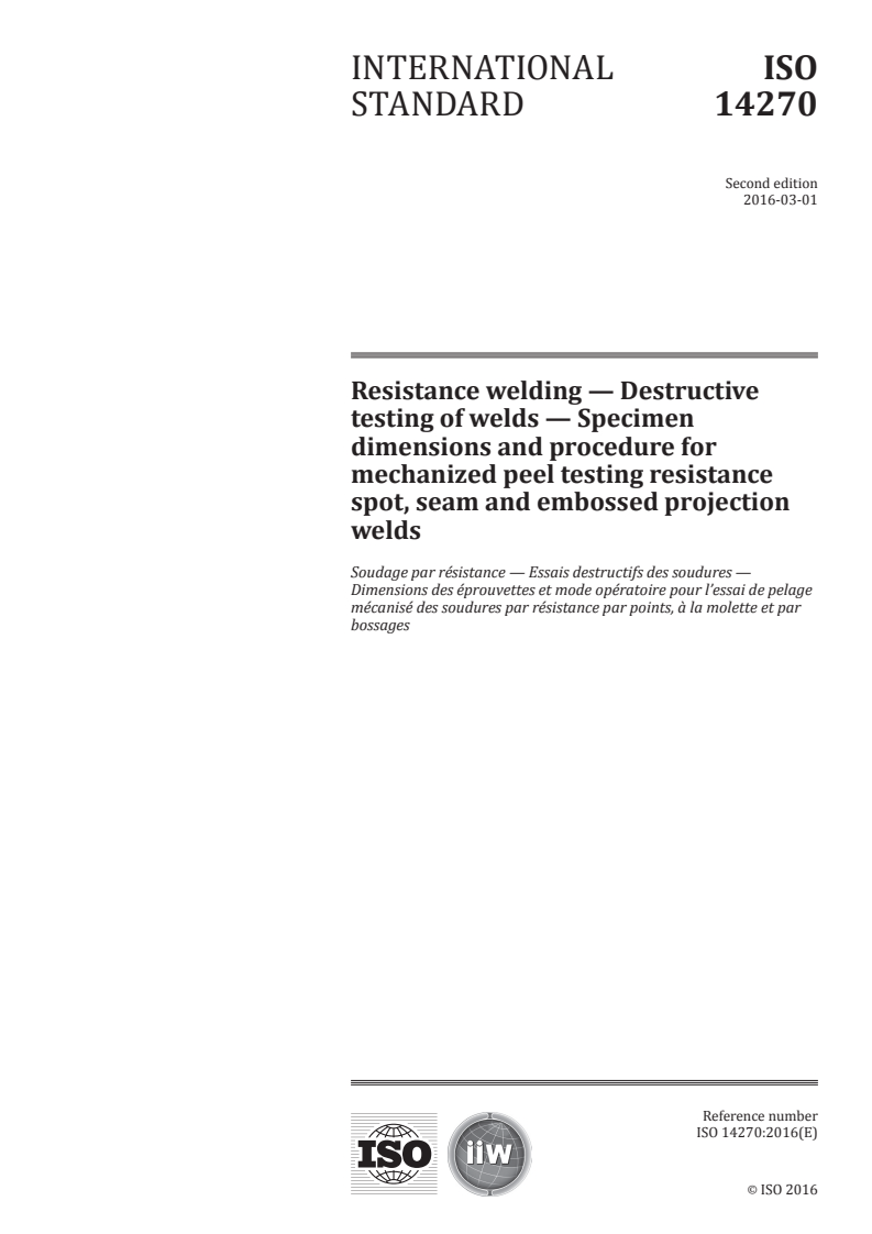 ISO 14270:2016 - Resistance welding — Destructive testing of welds — Specimen dimensions and procedure for mechanized peel testing resistance spot, seam and embossed projection welds/3/2016