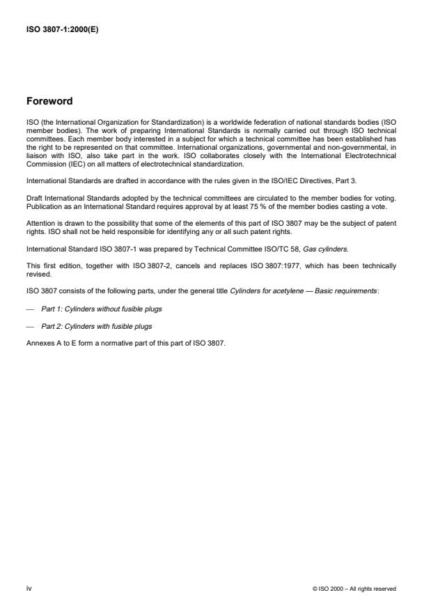 ISO 3807-1:2000 is a standard published by the International Organization for Standardization (ISO). Its full title is "Cylinders for acetylene — Basic requirements — Part 1: Cylinders without fusible plugs". This standard covers: Cylinders for acetylene — Basic requirements — Part 1: Cylinders without fusible plugs