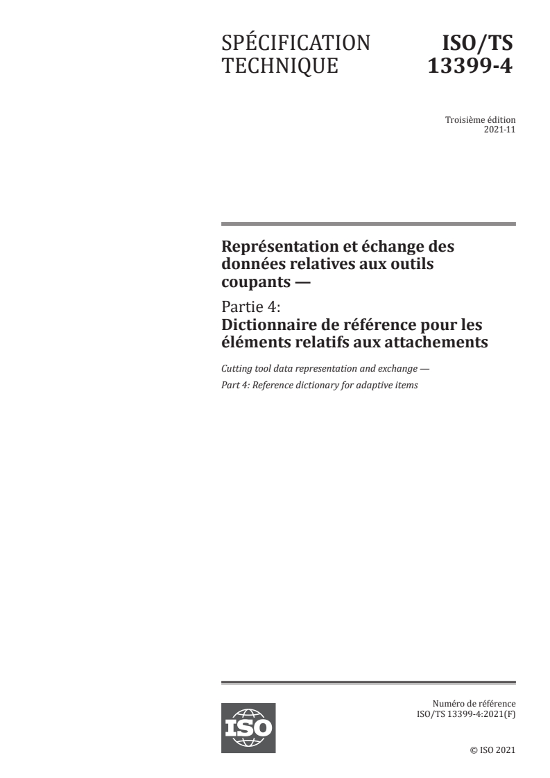 ISO/TS 13399-4:2021 - Représentation et échange des données relatives aux outils coupants — Partie 4: Dictionnaire de référence pour les éléments relatifs aux attachements Released:11/29/2021