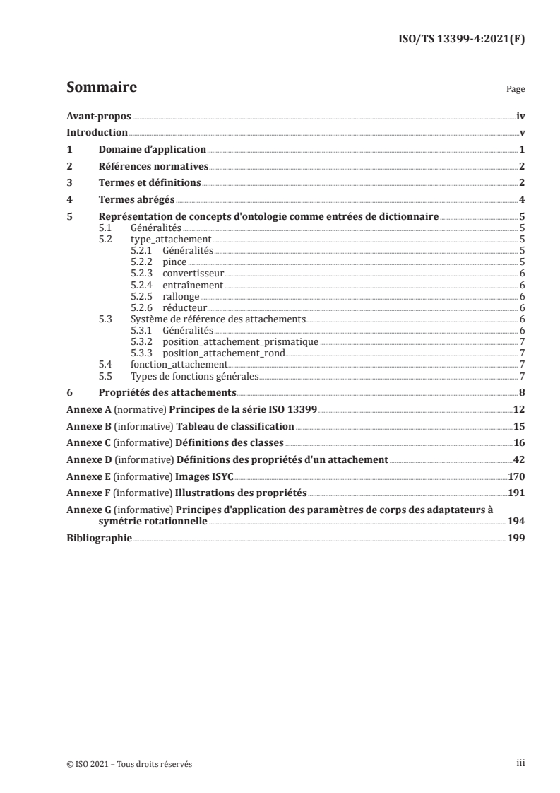 Le présent document spécifie un dictionnaire de référence pour les attachements, accompagnés de leurs propriétés descriptives et leurs domaines de valeurs. Le présent document spécifie un dictionnaire de référence comportant: — des définitions et identifications des classes d'attachements, avec un schéma de classification associé; — des définitions et identifications de types d'éléments de données qui représentent les propriétés des attachements; — des définitions et identifications de domaines de valeurs pour décrire les types d'éléments de données mentionnés ci-dessus. Les éléments suivants entrent dans le domaine d'application du présent document: — les données normalisées représentant les différentes classes d'attachements; — les données normalisées représentant les différentes propriétés des attachements; — les données normalisées représentant les domaines de valeurs utilisés pour les propriétés des attachements; — une méthode d’implémentation par laquelle les données normalisées définies dans le présent document peuvent être échangées. NOTE 1 La méthode d’implémentation par laquelle les données normalisées définies dans le présent document peuvent être échangées est spécifiée dans l'ISO 10303-21. Les éléments suivants n'entrent pas dans le domaine d'application du présent document: — les connaissances spécialisées et l'expertise en matière de conception et utilisation des outils coupants; — les règles permettant de déterminer quelles informations il convient de communiquer; — les applications où les données normalisées peuvent être stockées ou référencées; — les méthodes d’implémentation autres que celle définie dans le présent document par laquelle les données normalisées peuvent être échangées ou référencées; — le modèle d'information pour les outils coupants; — les définitions des classes et propriétés relatives aux éléments coupants; — les définitions des classes et propriétés relatives aux outils; — les définitions des classes et propriétés relatives aux assemblages; — les définitions des classes et propriétés relatives aux systèmes de connexion; — les définitions des classes et propriétés relatives aux systèmes de référence. NOTE 2 Le modèle d'information pour les outils coupants est défini dans l’ISO 13399-1. NOTE 3 Les définitions des classes et propriétés relatives aux éléments coupants, outils, et assemblages sont fournies dans l'ISO/TS 13399-2, l’ISO/TS 13399-3, et l’ISO/TS 13399-5. NOTE 4 Les définitions des classes et propriétés relatives aux systèmes de connexion et aux systèmes de référence sont fournies dans l'ISO/TS 13399-50.