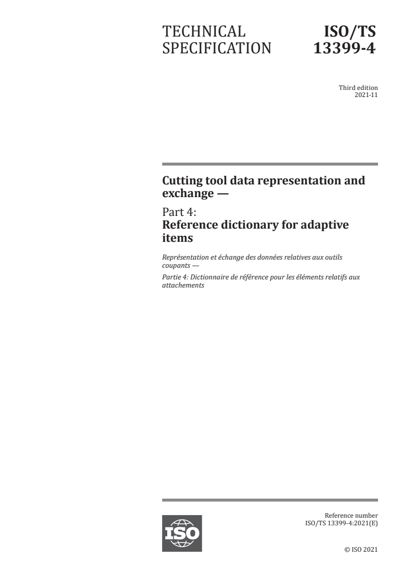 ISO/TS 13399-4:2021 - Cutting tool data representation and exchange — Part 4: Reference dictionary for adaptive items Released:11/22/2021