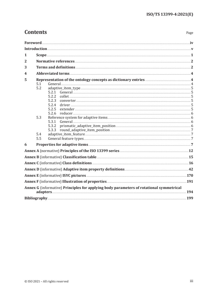 ISO/TS 13399-4:2021 is a technical specification published by the International Organization for Standardization (ISO). Its full title is "Cutting tool data representation and exchange — Part 4: Reference dictionary for adaptive items". This standard covers: This document specifies a reference dictionary for adaptive items, together with their descriptive properties and domains of values. This document specifies a reference dictionary containing: — definitions and identifications of the classes of adaptive items, with an associated classification scheme; — definitions and identifications of the data element types that represents the properties of adaptive items; — definitions and identifications of domains of values for describing the above-mentioned data element types. The following are within the scope of this document: — standard data that represent the various classes of adaptive items; — standard data that represent the various properties of adaptive items; — standard data that represent domains of values used for properties of adaptive items; — one implementation method by which the standard data defined in this document can be exchanged. NOTE 1 The implementation method by which the standard data defined in this document can be exchanged is specified in ISO 10303-21. The following are outside the scope of this document: — specialized or expert knowledge in the design and use of cutting tools; — rules to determine what information should be communicated; — applications where these standard data can be stored or referenced; — implementation methods other than the one defined in this document by which the standard data can be exchanged and referenced; — information model for cutting tools; — definitions of classes and properties for cutting items; — definitions of classes and properties for tool items; — definitions of classes and properties for assembly items; — definitions of classes and properties for connection systems; — definitions of classes and properties for reference systems. NOTE 2 The information model for cutting tools is defined in ISO 13399-1. NOTE 3 The definitions of classes and properties for cutting items, tool items, and assembly items are provided in ISO/TS 13399-2, ISO/TS 13399-3, and ISO/TS 13399-5. NOTE 4 The definitions of classes and properties for connection systems and reference systems are provided in ISO/TS 13399-50.
