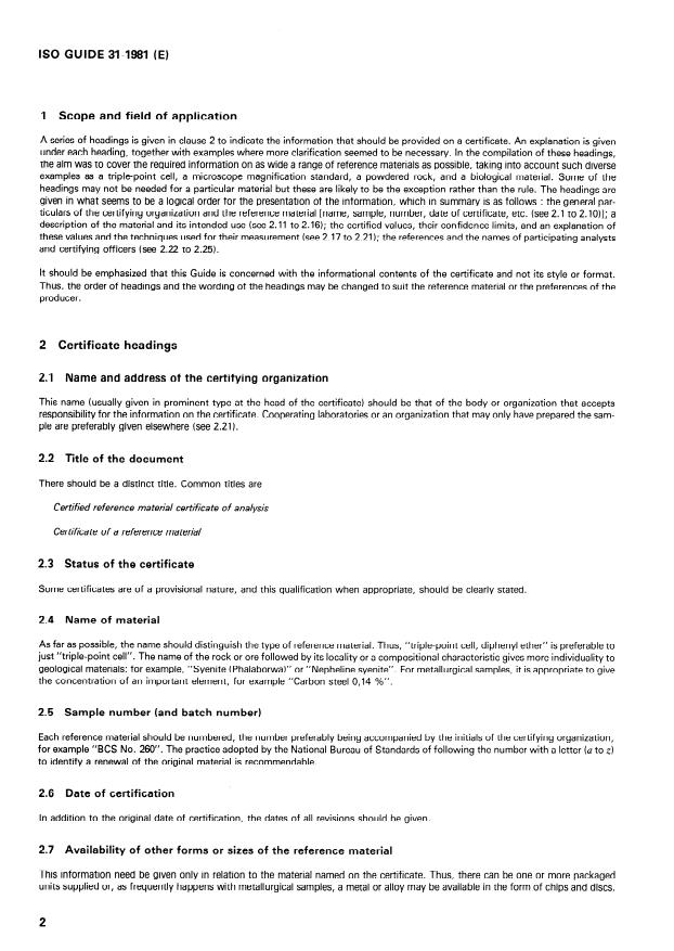 ISO Guide 31:1981 is a guide published by the International Organization for Standardization (ISO). Its full title is "Contents of certificates of reference materials". This standard covers: Contents of certificates of reference materials