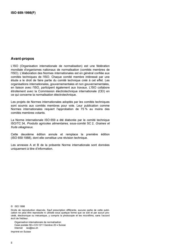 ISO 659:1998 is a standard published by the International Organization for Standardization (ISO). Its full title is "Oilseeds — Determination of oil content (Reference method)". This standard covers: La présente Norme internationale spécifie une méthode de référence pour la détermination de l'extrait à l'hexane (ou à l'éther de pétrole), dit "teneur en huile", des graines oléagineuses utilisées comme matière première industrielle. NOTE Sur demande, on peut analyser séparément: les graines pures et les impuretés (voir 9.3); les graines pures, les poussières totales, les impuretés non oléagineuses et oléagineuses, dans le cas de l'arachide. La méthode a été essayée sur des graines de colza, de soja et de tournesol. Ceci n'exclut, toutefois, la possibilité d'appliquer cette méthode à d'autres graines disponibles dans le commerce.