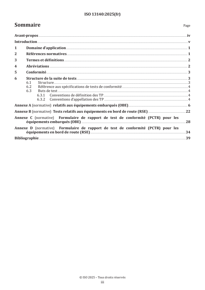 Le présent document spécifie la structure de la suite de tests (TSS, Test Suite Structure) et le but des tests (TP, Test Purpose) pour évaluer la conformité des équipements embarqués (OBE) et des équipements en bord de route (RSE) par rapport à l'ISO 13141. Il constitue une base pour les essais de conformité relatifs aux équipements de communication dédiée à courte portée (DSRC) afin de permettre l'interopérabilité entre les différents équipements fournis par les différents constructeurs. L'ISO 13141 spécifie les exigences applicables pour la communication d'augmentation de localisations (LAC), mais qui ne concernent pas le comportement fonctionnel interne des OBE ou RSE. Par conséquent, les essais relatifs au comportement fonctionnel des OBE et RSE restent en dehors du domaine d'application du présent document.