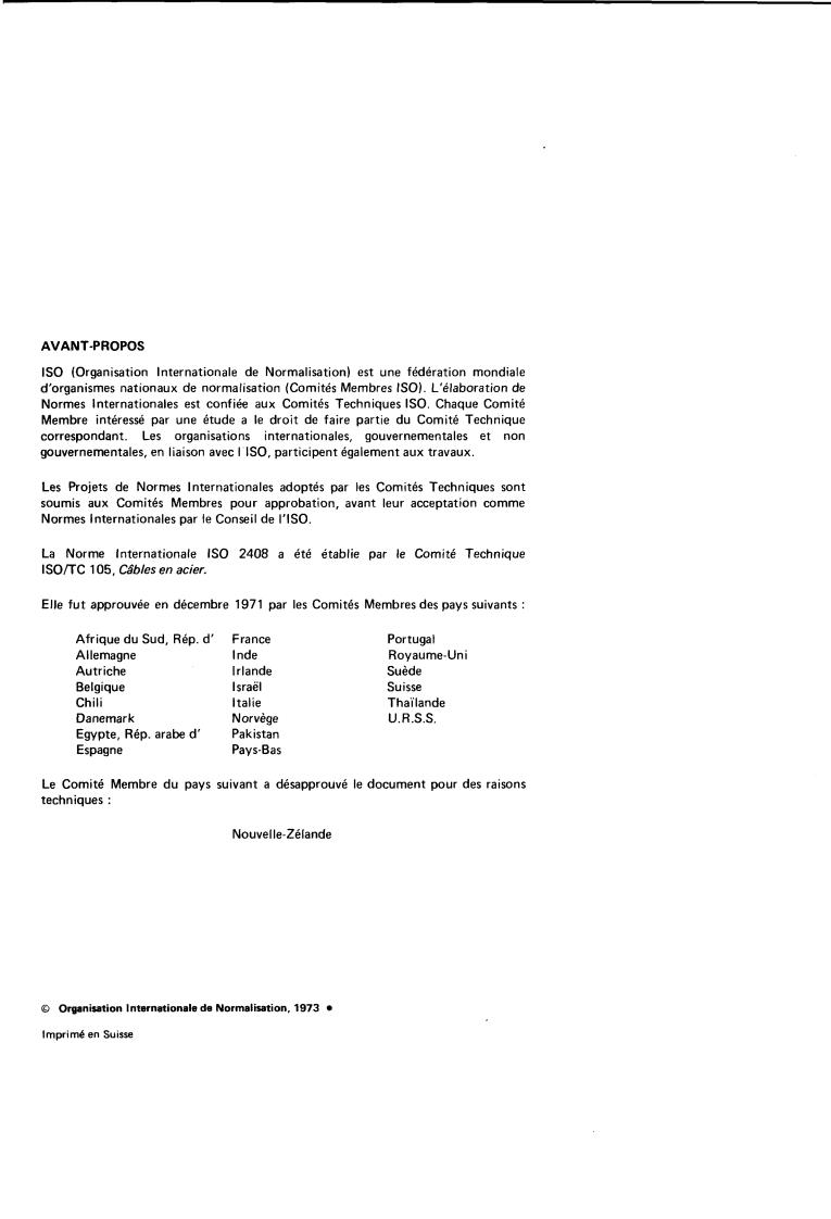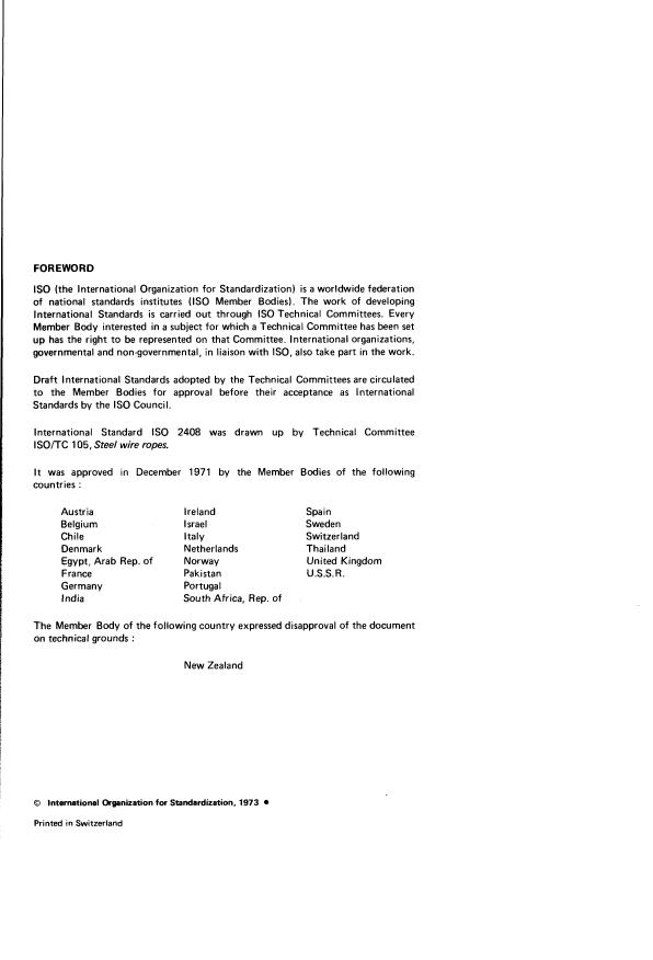 ISO 2408:1973 is a standard published by the International Organization for Standardization (ISO). Its full title is "Steel wire ropes for general purposes — Characteristics". This standard covers: Steel wire ropes for general purposes — Characteristics