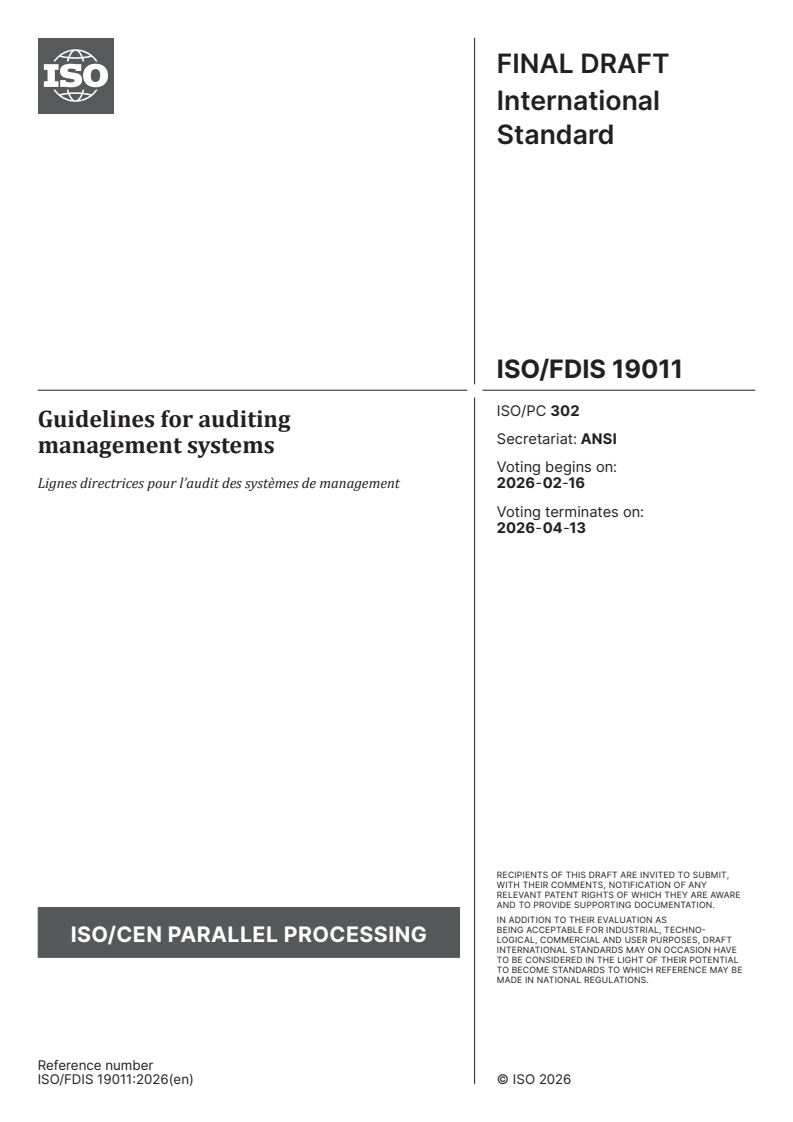 ISO/FDIS 19011 - Guidelines for auditing management systems Released:2. 02. 2026