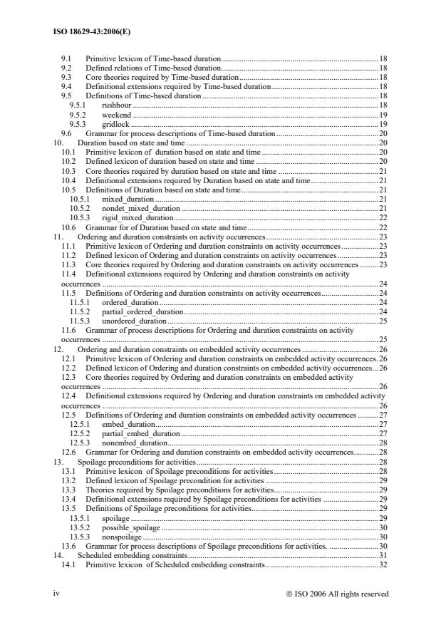 ISO 18629-43:2006 is a standard published by the International Organization for Standardization (ISO). Its full title is "Industrial automation systems and integration - Process specification language - Part 43: Definitional extension: Activity ordering and duration extensions". This standard covers: ISO 18629-43:2006 provides definitions written in the language of ISO 18629 for concepts related to activity extensions in the process specification language. The process specification language is aimed at structuring the semantic concepts intrinsic to the capture and exchange of process information related to discrete manufacturing.