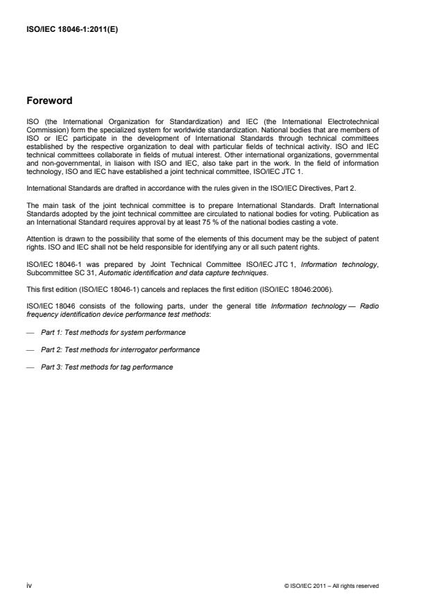 ISO/IEC 18046-1:2011 is a standard published by the International Organization for Standardization (ISO). Its full title is "Information technology - Radio frequency identification device performance test methods - Part 1: Test methods for system performance". This standard covers: ISO/IEC 18046-1:2011 defines test methods for performance characteristics of RFID systems for item management, and specifies the general requirements and test requirements for systems which are applicable to the selection of devices for an application. It does not apply to testing in relation to regulatory or similar requirements.