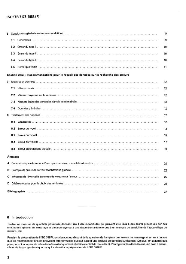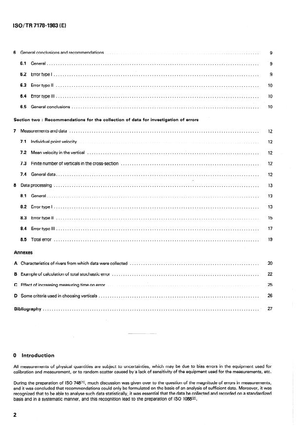 ISO/TR 7178:1983 is a technical report published by the International Organization for Standardization (ISO). Its full title is "Liquid flow measurement in open channels — Velocity-area methods — Investigation of total error". This standard covers: Summarizes the results of investigations of the total error in measurements of flow by velocity-area methods. Describes the procedure used and types of errors (section one), and gives recommendation for the collection of data for investigations of errors (section two) with a view to supplementing the information given in ISO 1088.