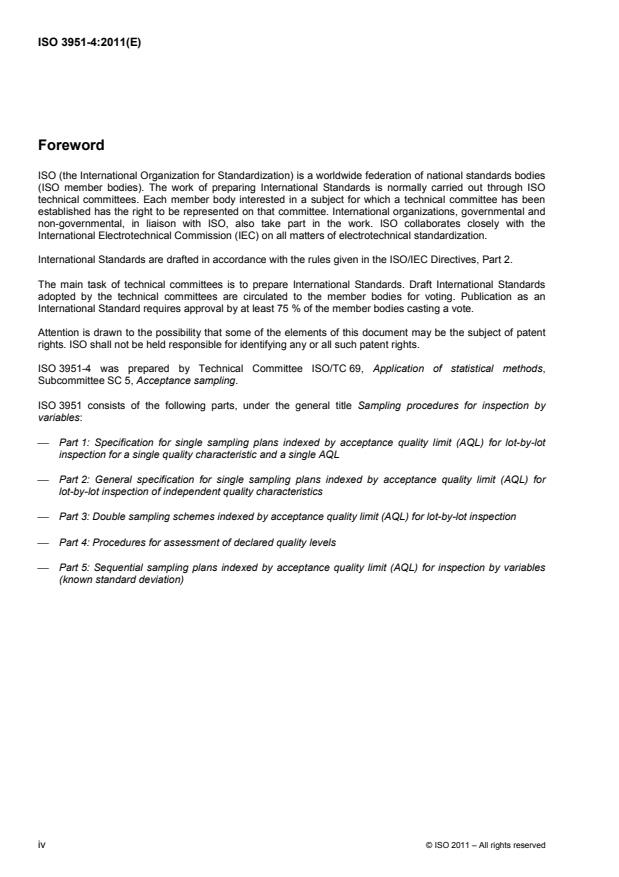ISO 3951-4:2011 is a standard published by the International Organization for Standardization (ISO). Its full title is "Sampling procedures for inspection by variables - Part 4: Procedures for assessment of declared quality levels". This standard covers: ISO 3951-4:2011 establishes sampling plans and procedures by variables that can be used to assess whether the quality level of an entity (lot, process, etc.) conforms to a declared value. The sampling plans have been devised so that their operating characteristic curves match those of the corresponding attributes plans in ISO 2859-4 as closely as possible, so that the choice between using sampling by attributes and sampling by variables is not influenced by attempts to increase the chance of accepting an incorrectly declared quality level. In this part of ISO 3951, there is a risk of between 1,4 % and 8,2 % of contradicting a correct declared quality level. The risk is 10 % of failing to contradict an incorrect declared quality level which is related to the limiting quality ratio. Sampling plans are provided corresponding to three levels of discriminatory ability, and for the cases of unknown and known process standard deviation. In contrast to the procedures in the other parts of ISO 3951, the procedures in ISO 3951-4:2011 are not applicable to acceptance assessment of lots. Generally, the balancing of the risks of reaching incorrect conclusions in assessment procedures will differ from the balancing in the procedures for acceptance sampling. ISO 3951-4:2011 may be used for various forms of quality inspection in situations where objective evidence of conformity to some declared quality level is to be provided by means of inspection of a sample. The procedures are applicable to entities such as lots, process output, etc. that allow random samples of individual items to be taken from the entity. The sampling plans provided are applicable, but not limited, to inspection of a variety of products such as: end items; components and raw materials; operations; materials in process; supplies in storage; maintenance operations; data or records; administrative procedures. The procedures are intended to be used when the quality characteristics are measurable variables that are independent and normally distributed, and where the quantity of interest is the fraction of items that are nonconforming.