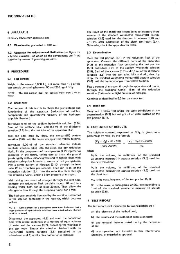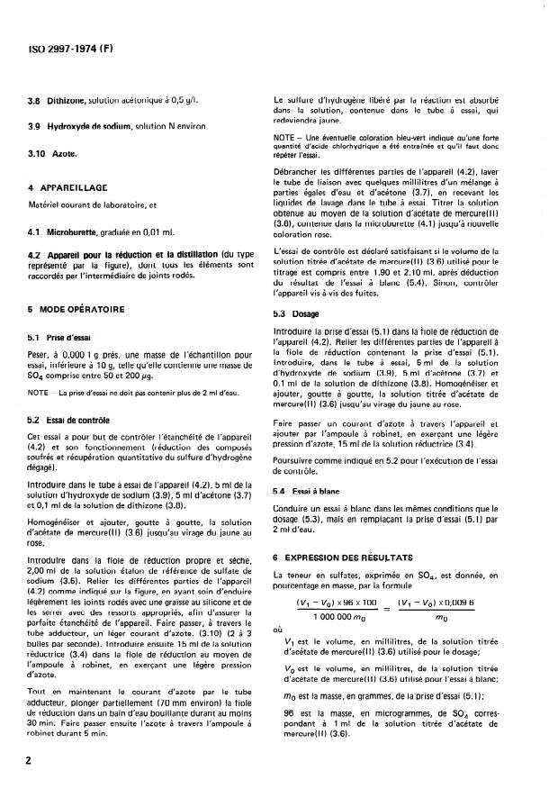 ISO 2997:1974 is a standard published by the International Organization for Standardization (ISO). Its full title is "Phosphoric acid for industrial use - Determination of sulphate content - Method by reduction and titrimetry". This standard covers: Applicable to products having sulphate contents equal to or more than 0.0005 % (m/m). Analysis by reduction of the sulphate to sulphide by a mixture of hydriodic acid and hypophosphorus acid. Absorption of the hydrogen sulphide evolved in a mixture of acetone and sodium hydroxide solution. Titration with a standard volumetric solution of mercury(II) acetate in the presence of dithizone as indicator. Has also been approved by the IUPAC.