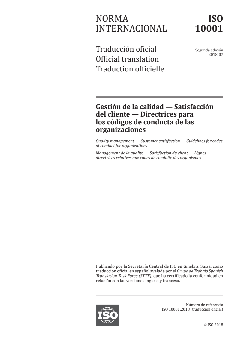 ISO 10001:2018 - Management de la qualité — Satisfaction du client — Lignes directrices relatives aux codes de conduite des organismes Released:7/16/2018