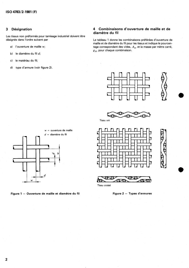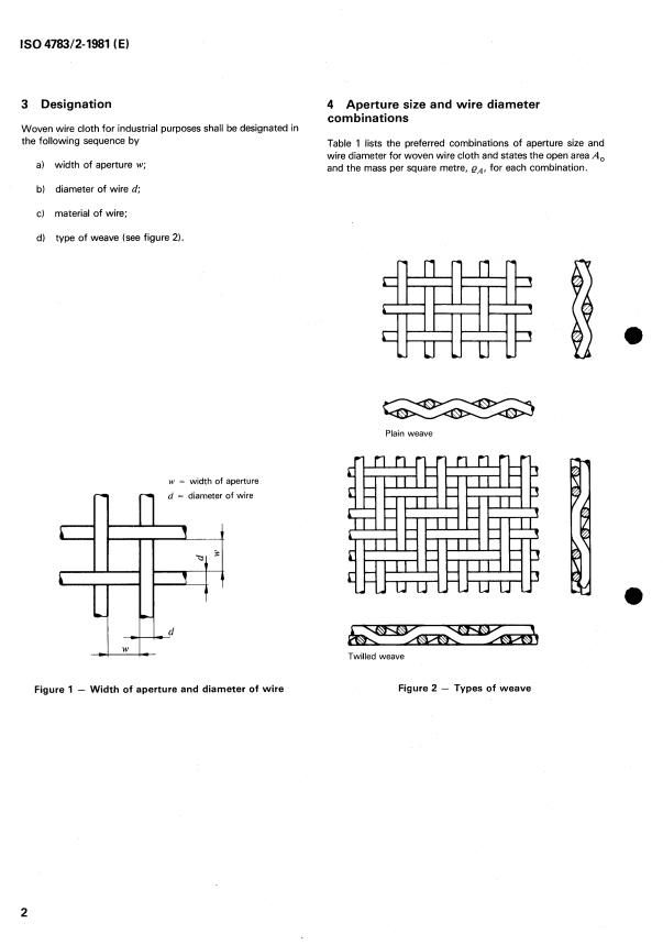 ISO 4783-2:1981 is a standard published by the International Organization for Standardization (ISO). Its full title is "Industrial wire screens and woven wire cloth — Guide to the choice of aperture size and wire diameter combinations — Part 2: Preferred combinations for woven wire cloth". This standard covers: Industrial wire screens and woven wire cloth — Guide to the choice of aperture size and wire diameter combinations — Part 2: Preferred combinations for woven wire cloth