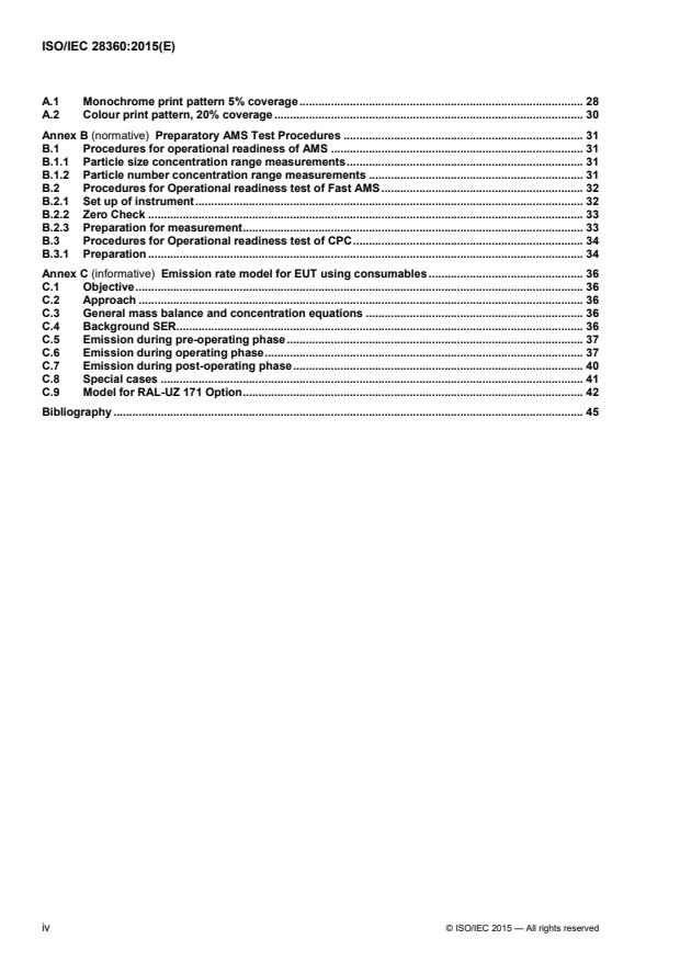 ISO/IEC 28360:2015 is a standard published by the International Organization for Standardization (ISO). Its full title is "Information technology — Office equipment — Determination of chemical emission rates from electronic equipment". This standard covers: ISO/IEC 28360:2015 specifies methods to determine chemical emission rates of Analyte from ICT & CE equipment during intended operation in an Emission Test Chamber (ETC). The methods comprise preparation, sampling (or monitoring) in a controlled ETC, storage and analysis, calculation and reporting of emission rates. This International Standard includes specific methods for equipment using consumables, such as printers, and equipment not using consumables, such as monitors and PC's. Annex A specifies monochrome and colour print patterns for use in the operating phase of EUT using consumables (e.g. paper). Examples of EUT that do not use consumables are: · Monitors and TV sets (CRT, Plasma, LCD, Rear projector, Beamer). · Video (VCR, DVD Player/Recorder, Camcorder). · SAT Receiver (Set-Top Box). · Audio units (CD Player/Recorder, Home theatre Systems, Audio Home Systems, Micro-/Mini, Midi Systems, Amplifier, Receiver). · Portable Audio (CD Player, MP 3 Player, Radio recorder, Clock radio etc). · Computer (desktop, tower, server), portable computers (Notebooks). Emission rates from EUT using consumables may also be determined according to additional requirements identified by "RAL-UZ 171 Option". Calculations use the generalised model and approximations thereof as developed in Annex C. The emission rates determined with this method may be used to compare equipment in the same class. Predictions of "real indoor" concentrations from the determined emission rates are outside the scope of this International Standard.