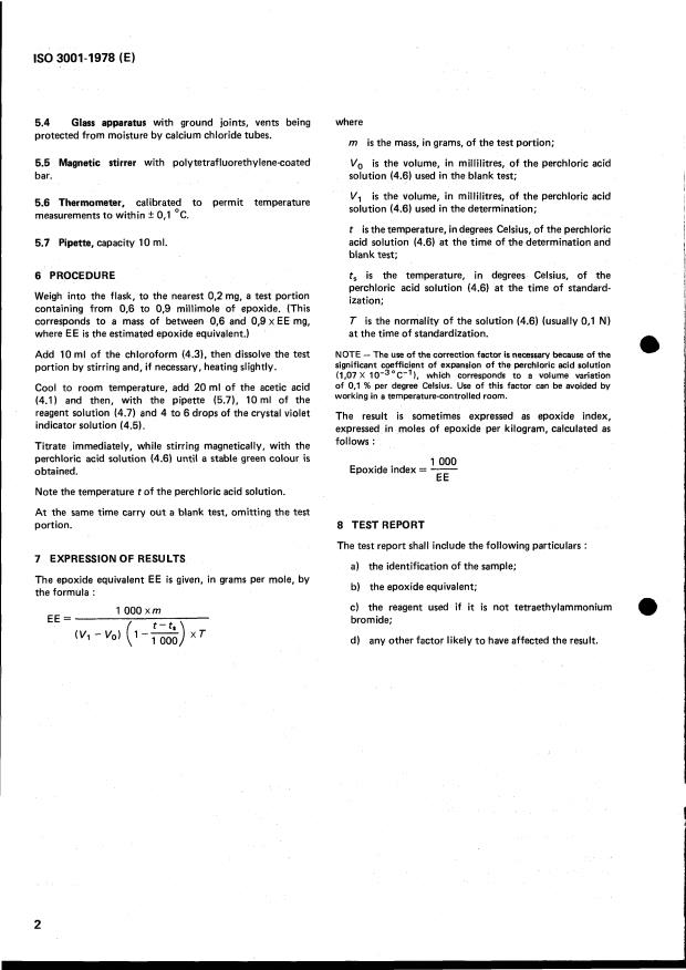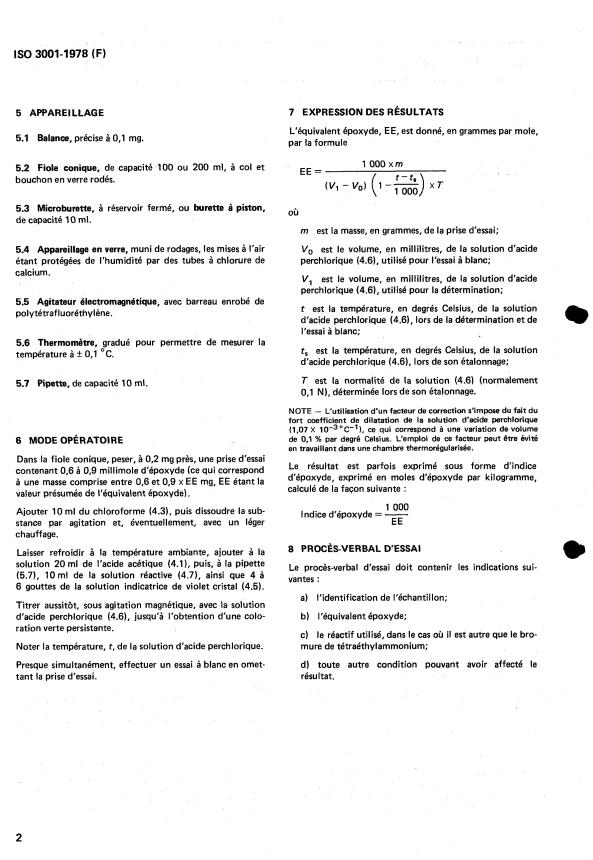 ISO 3001:1978 is a standard published by the International Organization for Standardization (ISO). Its full title is "Plastics — Epoxide compounds — Determination of epoxide equivalent". This standard covers: Plastics — Epoxide compounds — Determination of epoxide equivalent