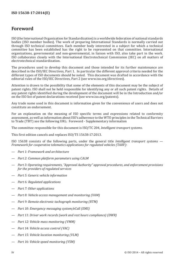 Keywords: ISO 15638-17:2014, consignment and location monitoring, TARV, intelligent transport systems, CLM, IVS, telematics, data naming, quality of service, regulatory telematics.
