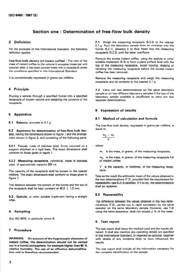 ISO 8460:1987 - Instant coffee -- Determination of free-flow and compacted bulk densities