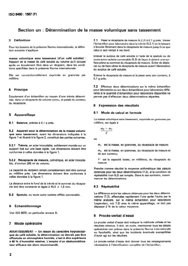 ISO 8460:1987 - Café soluble -- Détermination de la masse volumique sans tassement et apres tassement