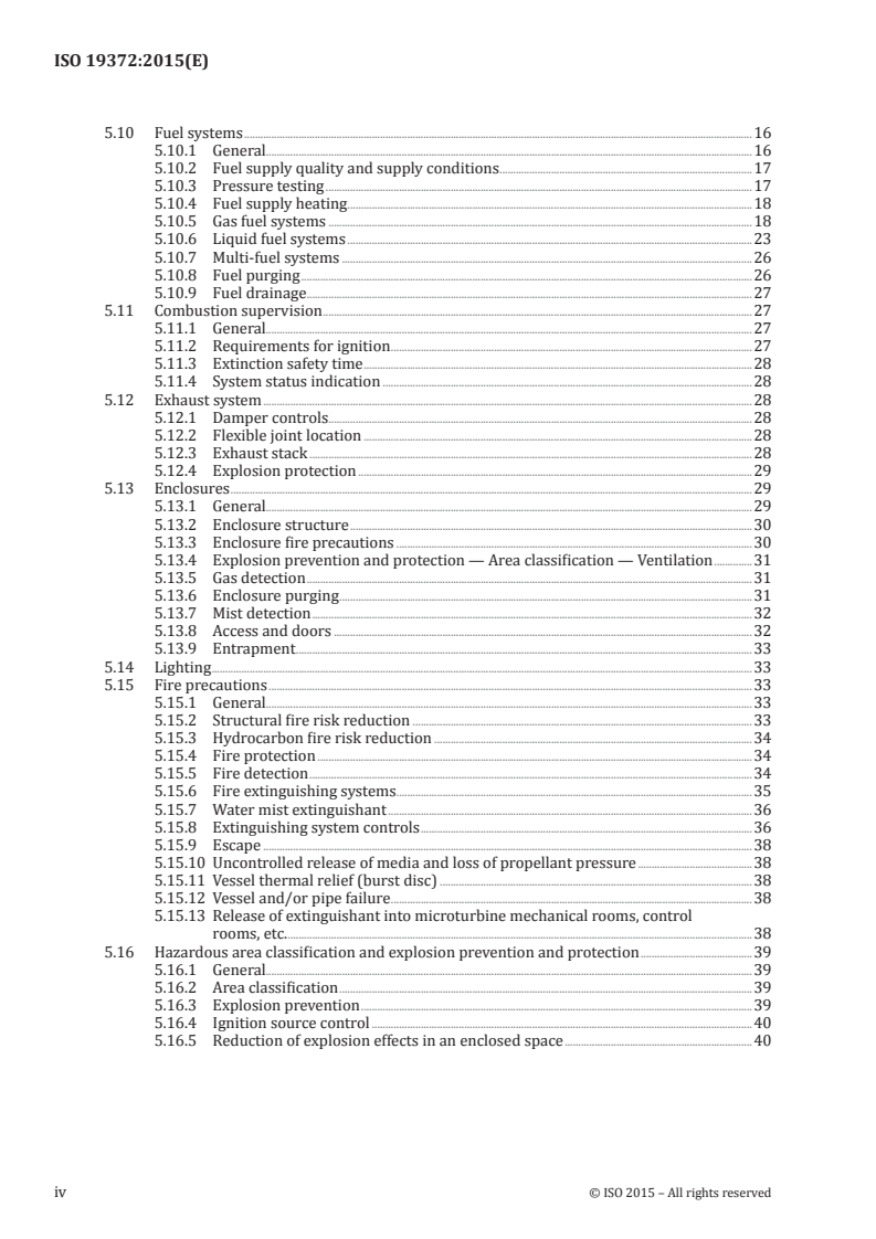 ISO 19372:2015 covers the safety requirements for industrial, commercial, and residential automated stationary microturbine (micro gas turbine) engine generator assemblies with an individual system or subsystem output rating with nominal supply voltages not exceeding 1 000 V for alternating current (A.C.) and not exceeding 1 500 V for direct current (D.C.), 500 kW per individual unit/subsystem or less that are intended for installation and use in ordinary and hazardous location using liquid or gaseous fuels and the safety related control and detection systems and essential auxiliaries for all types of open cycles, closed-cycle, and semi-closed (simple, combined, regenerative, reheat, etc.) used in onshore and offshore applications including floating production platforms.